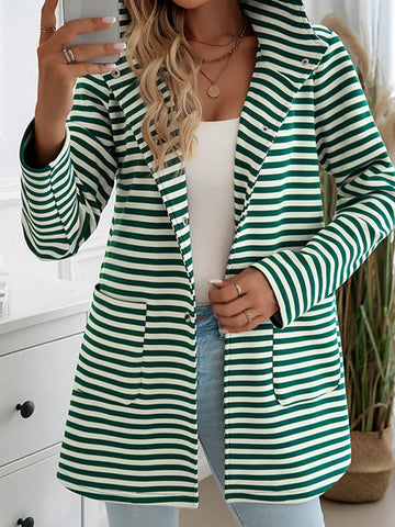 Hooded Long Sleeves Buttoned Contrast Color Pockets Split-Joint Striped Outerwear